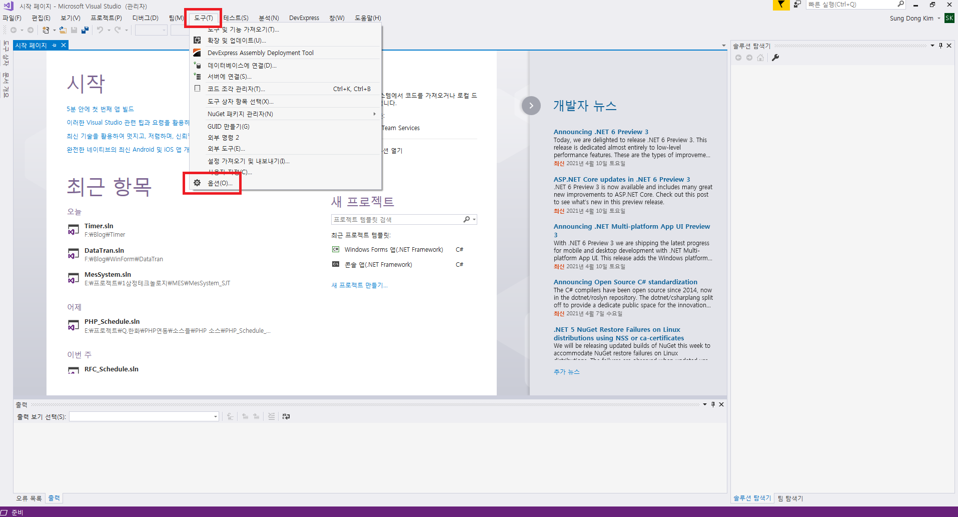 Visual Studio를 실행하셔서 하단의 이미지처럼 도구의 옵션 창에 들어가면 프로젝트 옵션 팝업이 나타납니다.