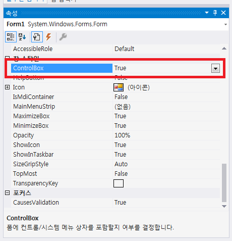 3. 속성에서 ControlBox여부를 false로 변경합니다.