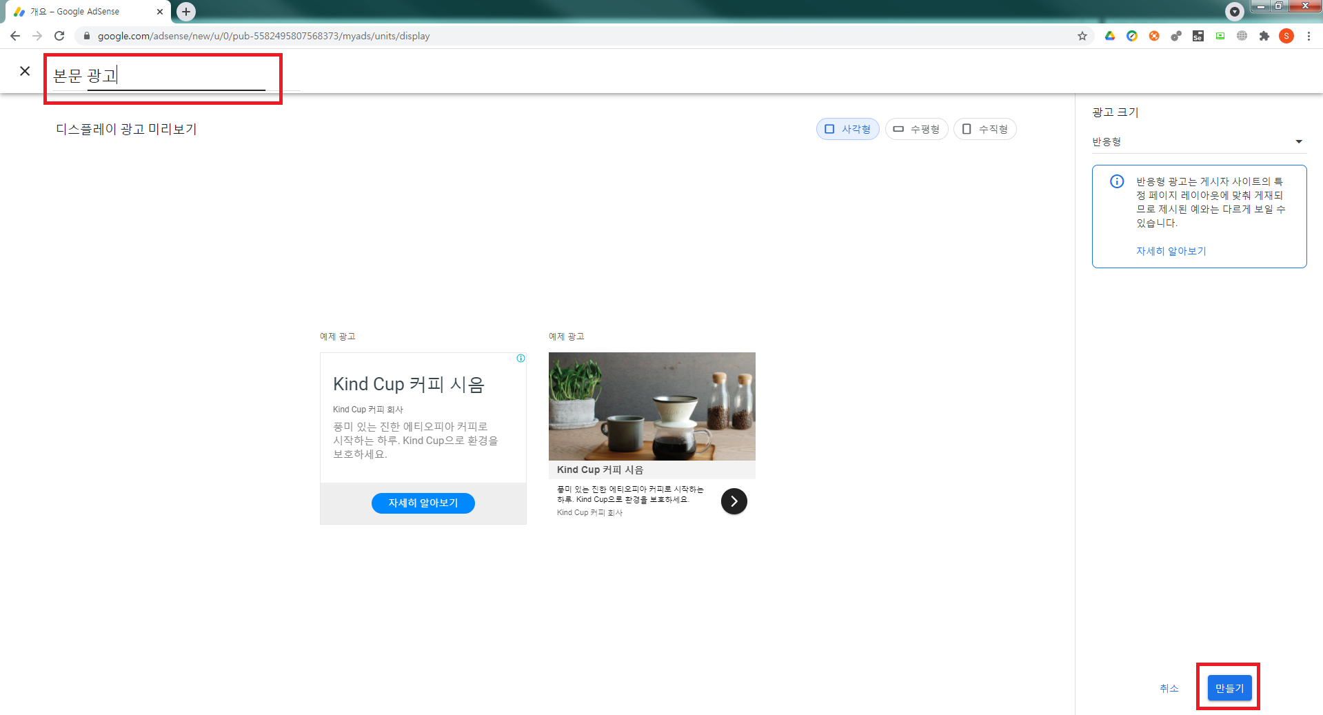 선택을 마쳤으면 "만들기"버튼을 클릭해서 본문 광고를 만들어줍니다