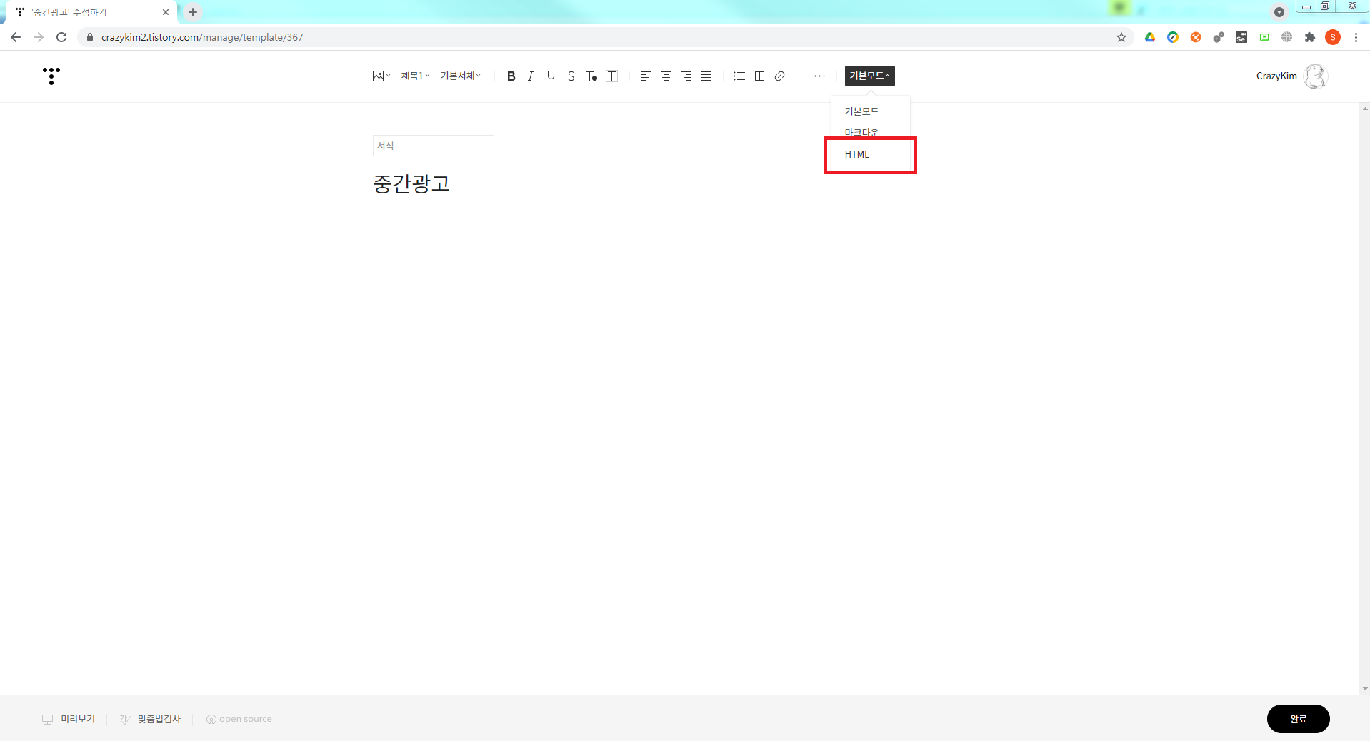 오른쪽 상단위 HTML을 클릭하여 기본모드로 변경해줍니다