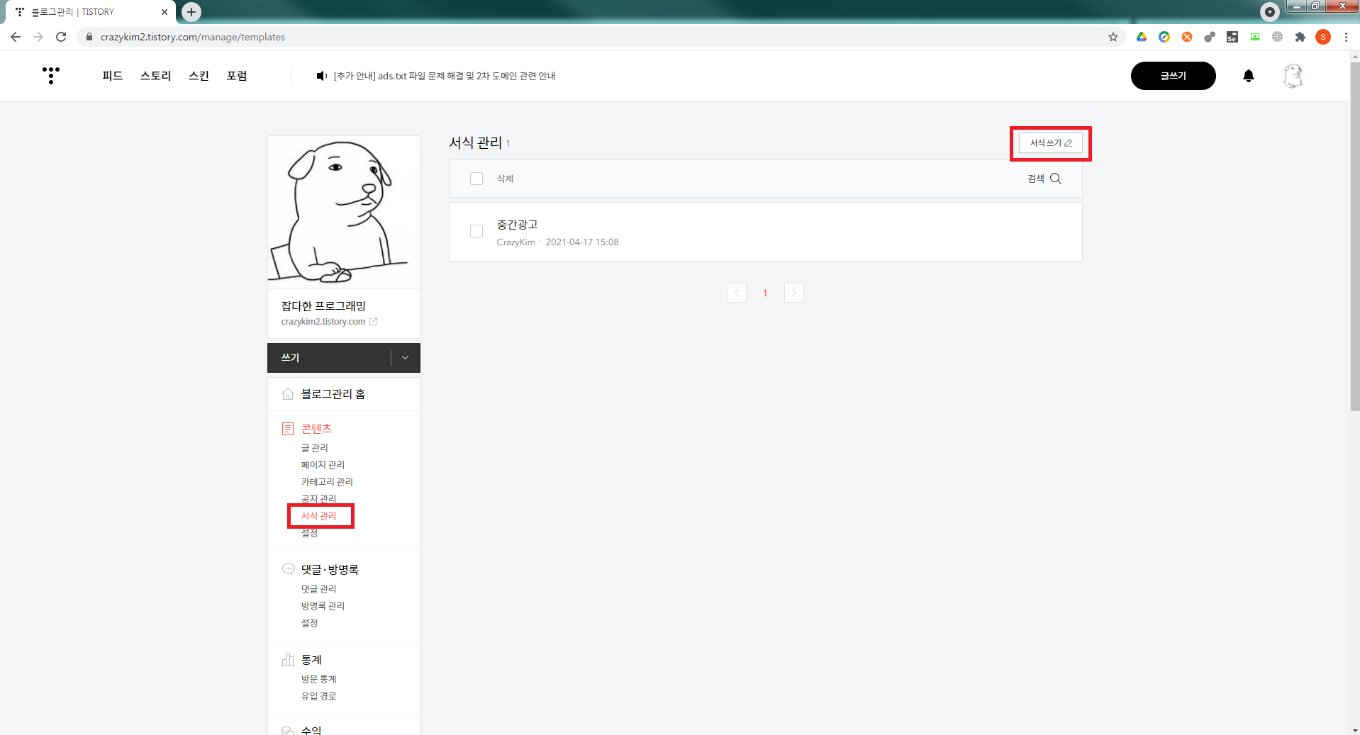 7. 서식 쓰기 페이지로 이동하여 HTML코드를 붙여줘야합니다