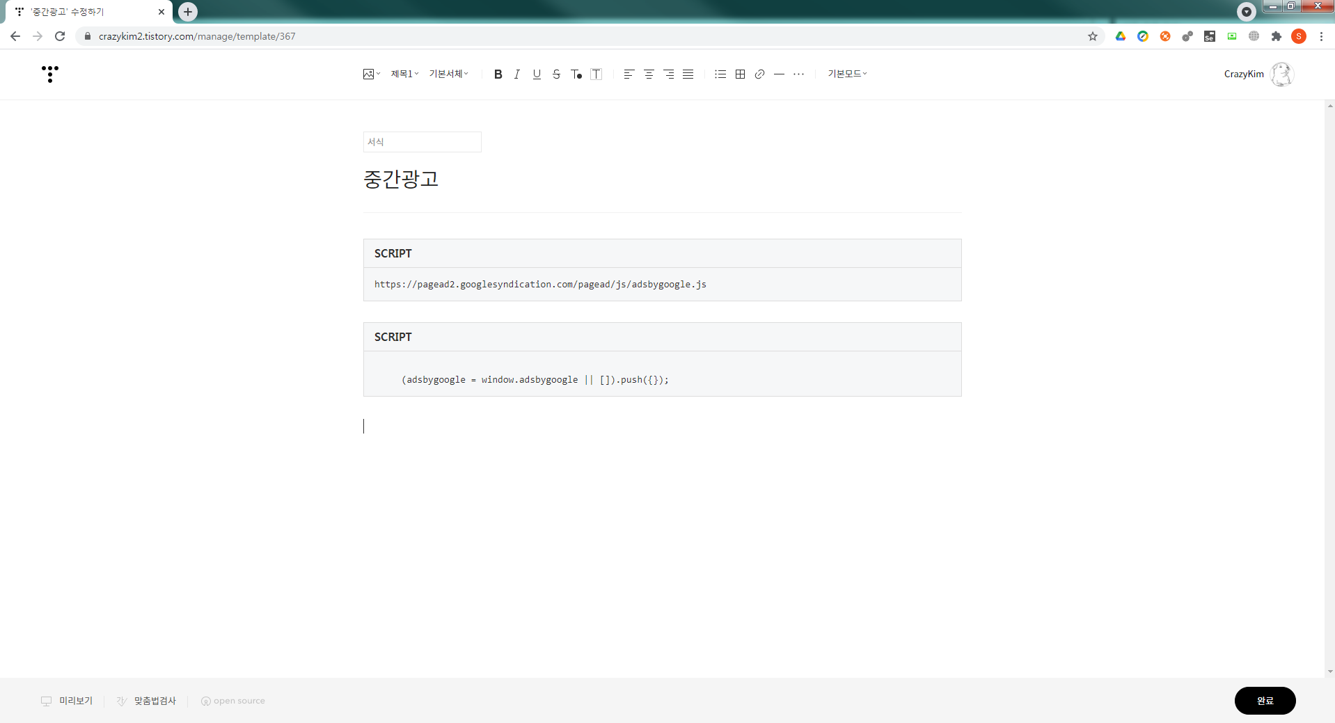 9. 정상적으로 광고코드가 복사되었으면 아래의 같은 SCRIPT이미지 두 개가 나타날 것입니다
