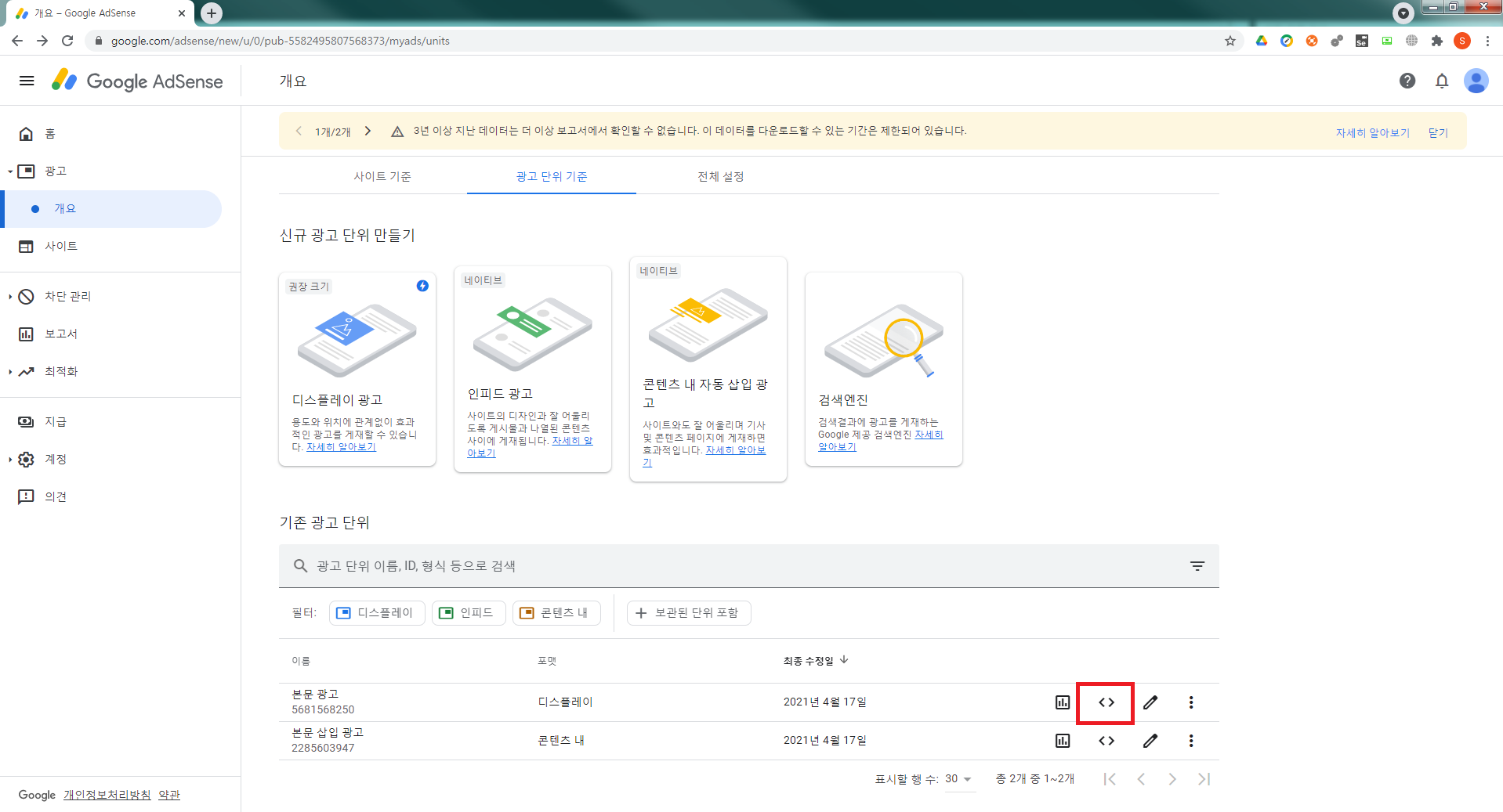 추가한 광고 단위의 "<>"아이콘을 선택합니다