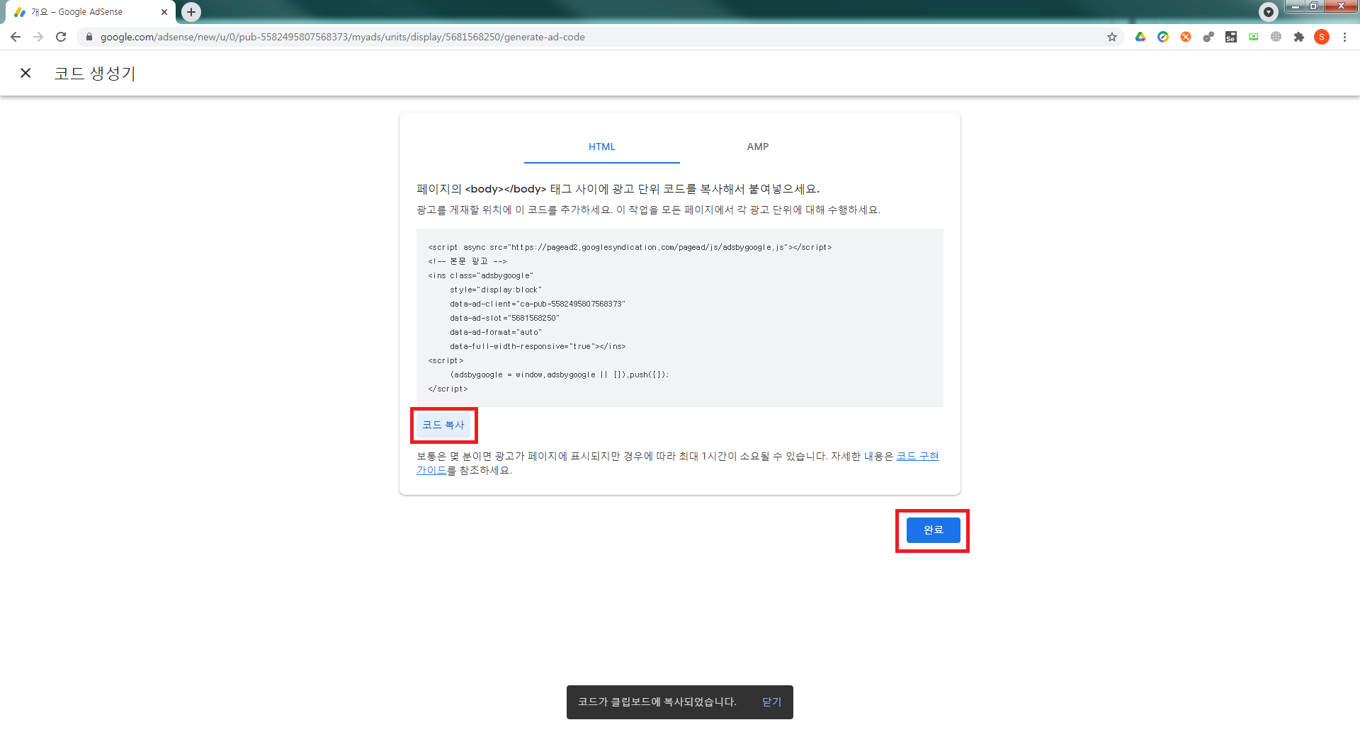 이제 광고 단위의 HTML코드를 복사할 차례입니다