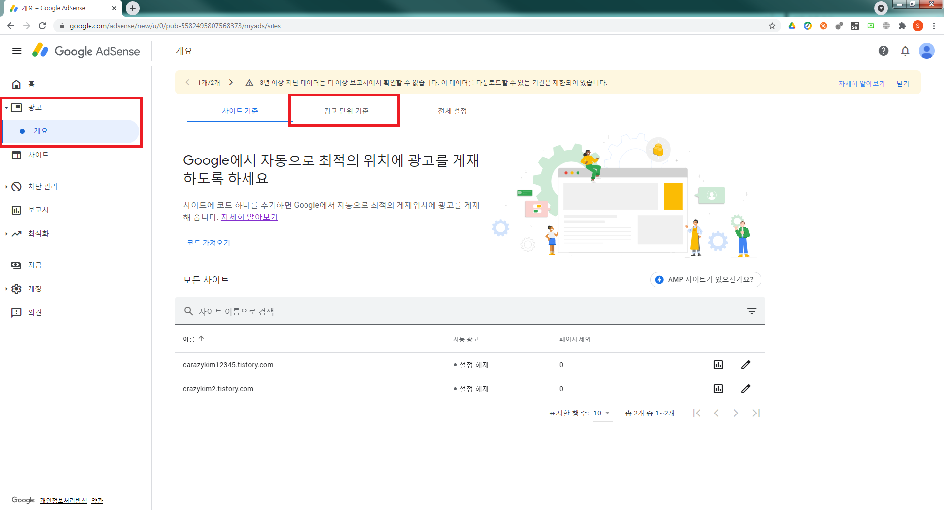 메인화면의 "광고 단위 기준"탭에 접속해줍니다