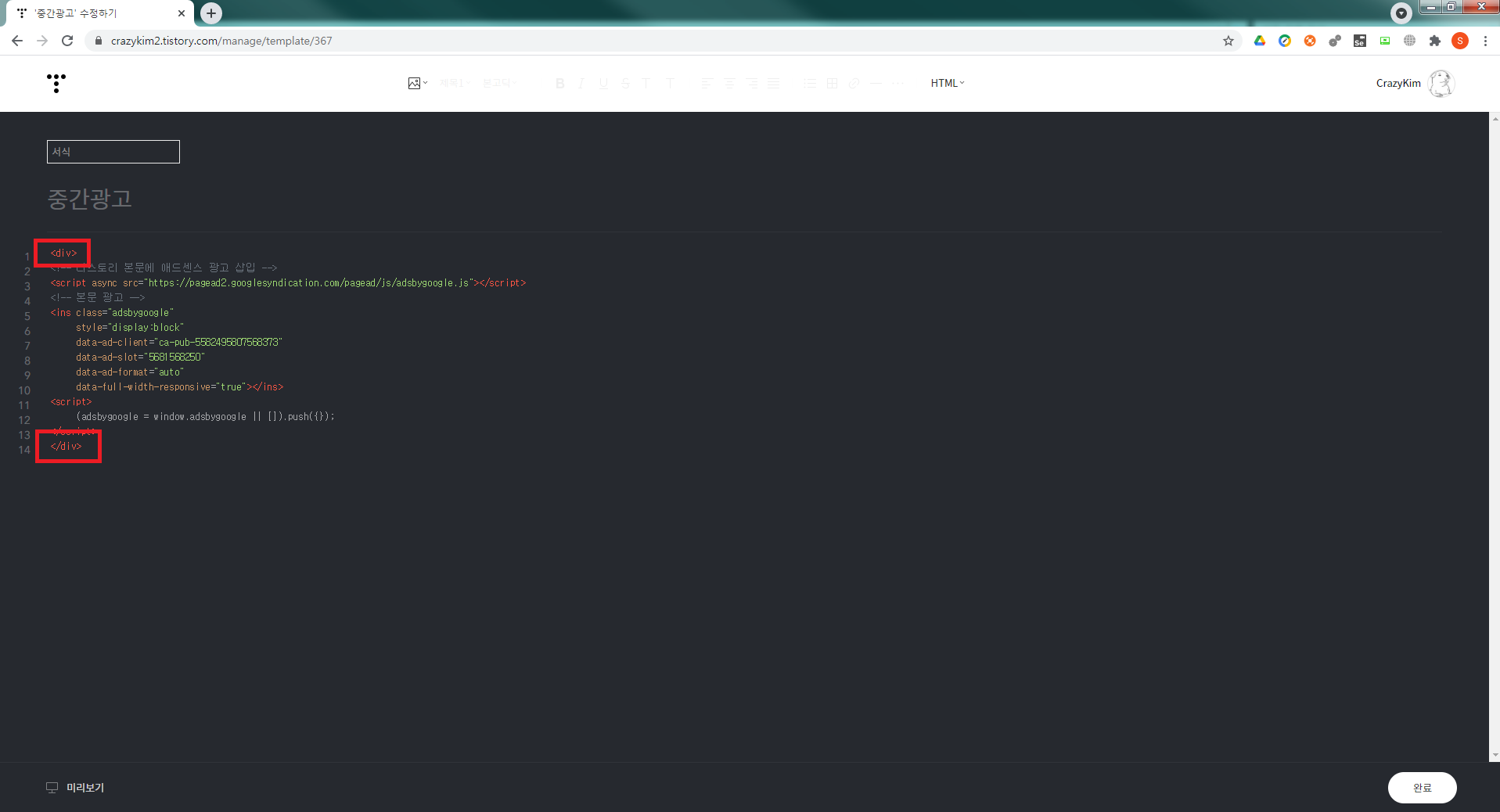 HTML코드를 붙여넣고 처음과 끝에 <div> </div>를 추가해줍시다