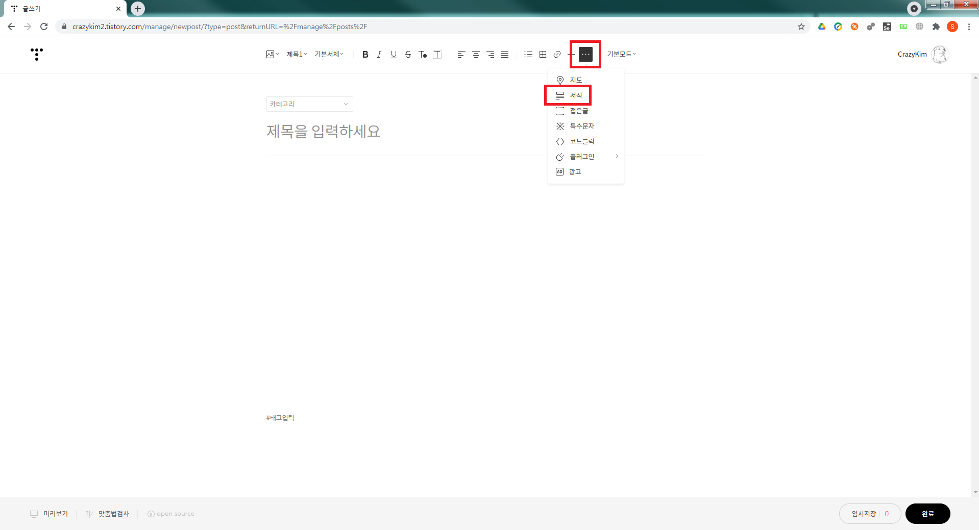 글쓰기 에디터의 오른쪽 상단을 보시면 "..." 아이콘을 선택합니다