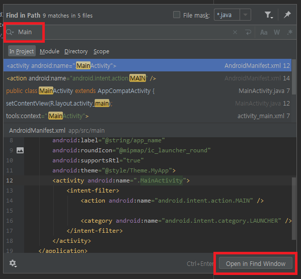 아니면 하단의 Open in Find Window를 클릭하면 프로젝트에서 전체에서 문자열이 어디있는지 리스트가 펼쳐집니다