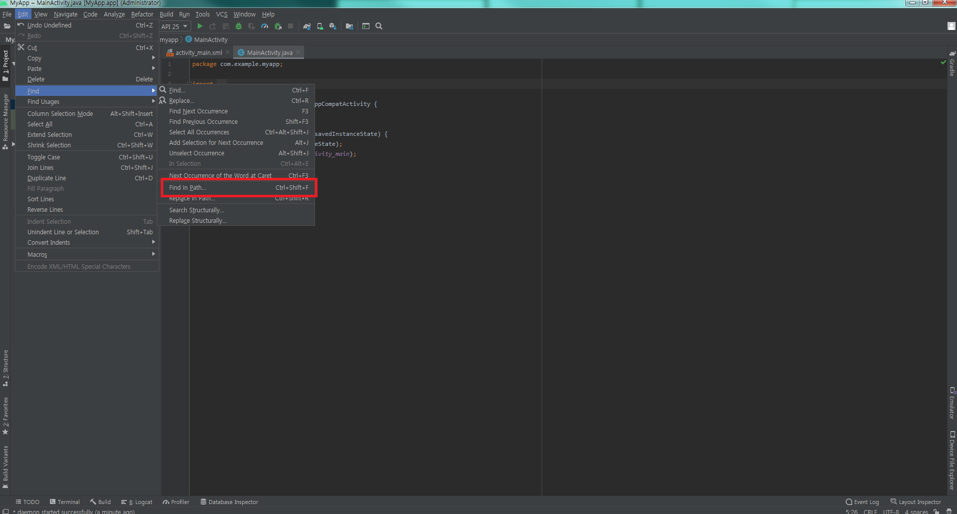 1. 안드로이드 스튜디오 상단에서 Edit - Find - Find in Path에 실행합니다