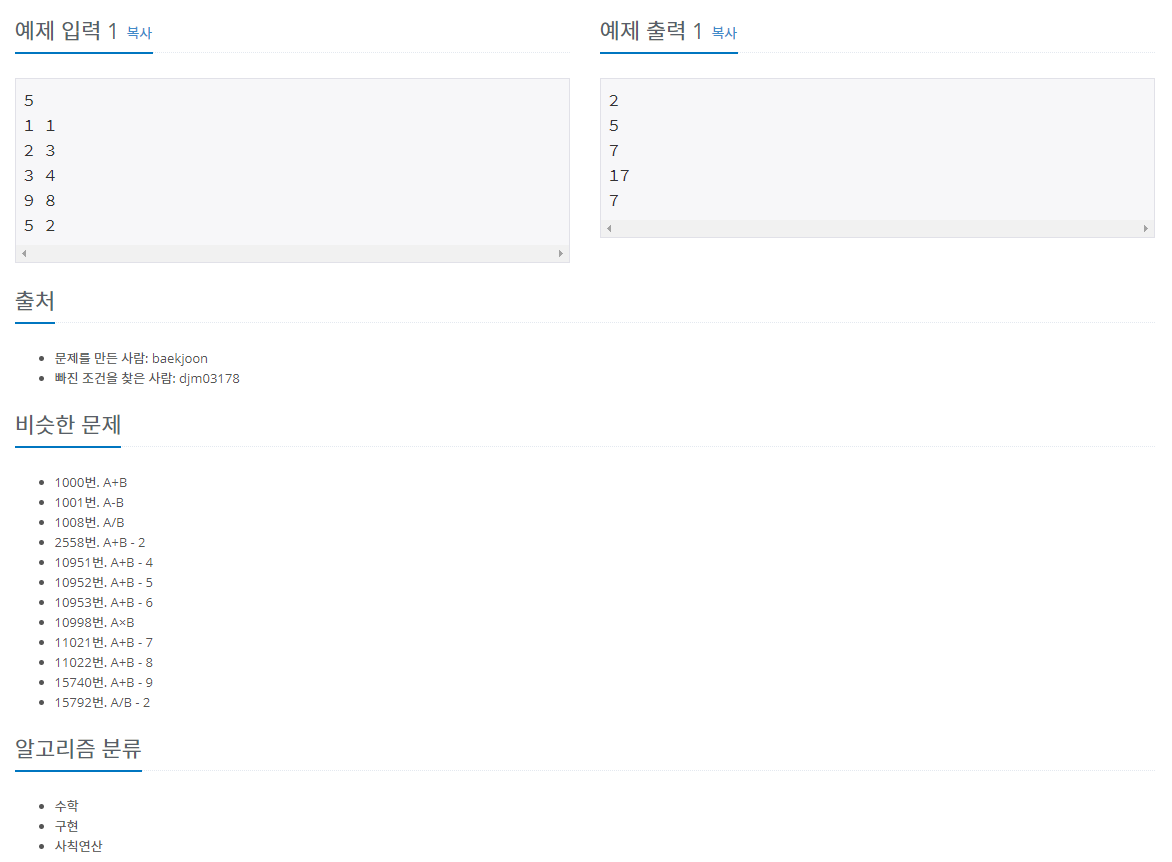 각 테스트 케이스는 한 줄로 이루어져 있으며, 각 줄에 A와 B가 주어진다. (0 < A, B < 10)