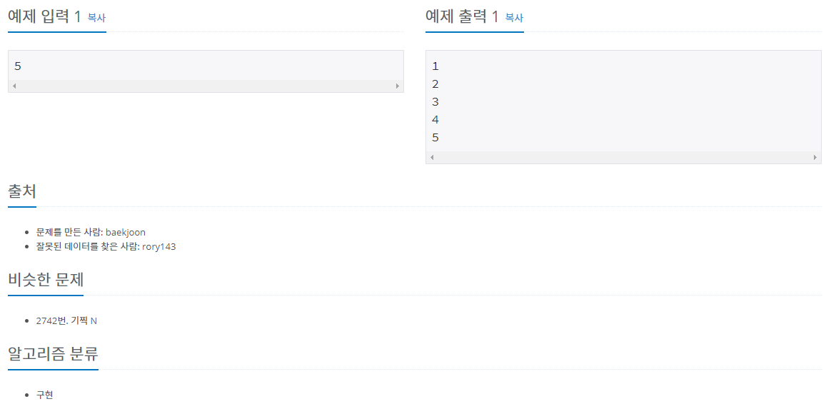 백준 알고리즘의 단계별로 풀어보기 3단계 2741번 문제 N 찍기를 풀어봤습니다