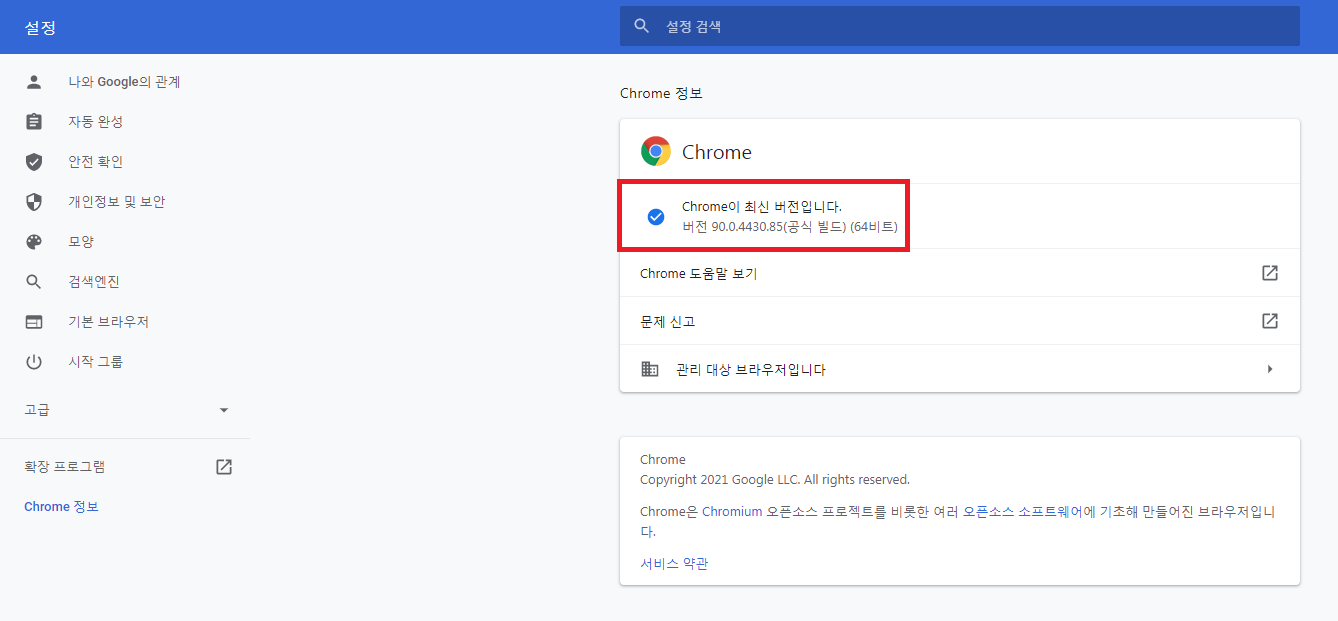 최신 크롬 버전으로 설치된 것을 확인할 수 있습니다