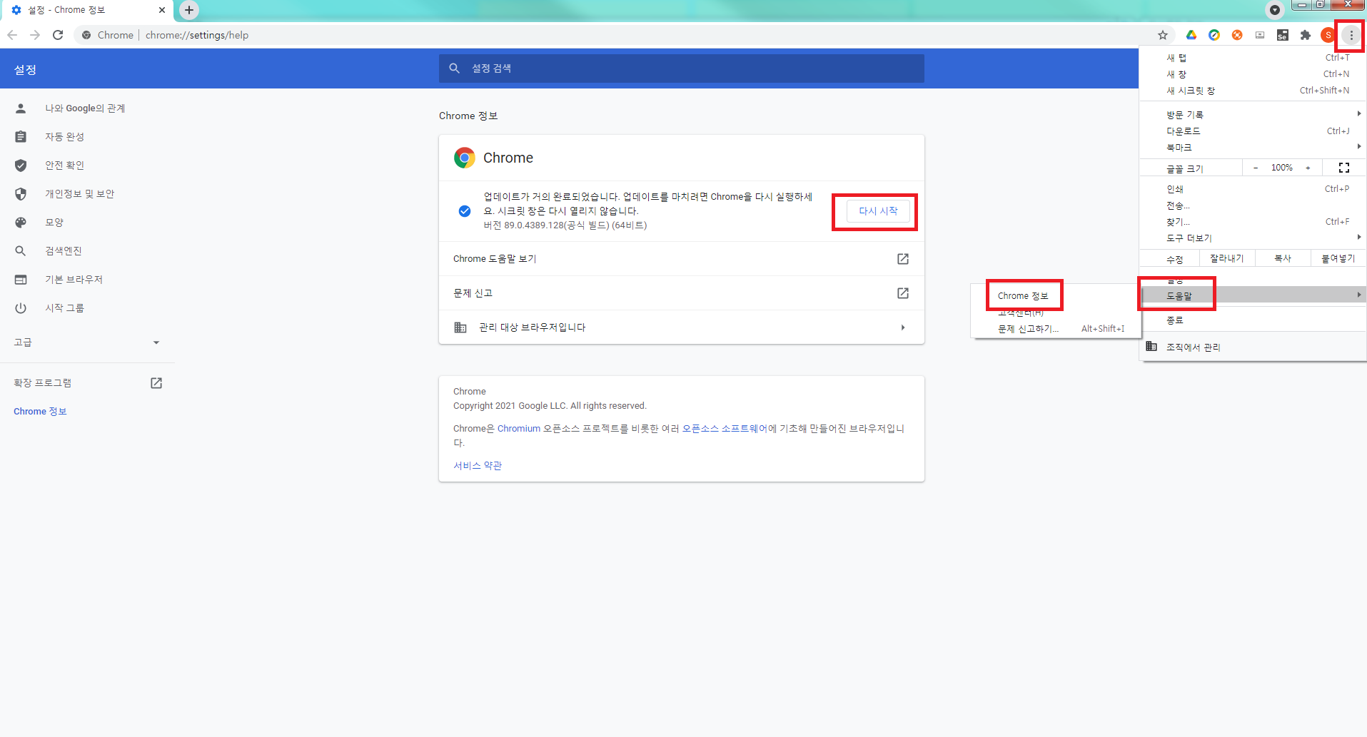 만약 최신정보가 아니라면 "업데이트가 거의 완료되었습니다. 업데이트를 마치려면 Chrome을 다시 실행하세요. 시크릿 창은 다시 열리지 않습니다"라는 메시지가 뜨면서 다시 시작 버튼이 활성화됩니다