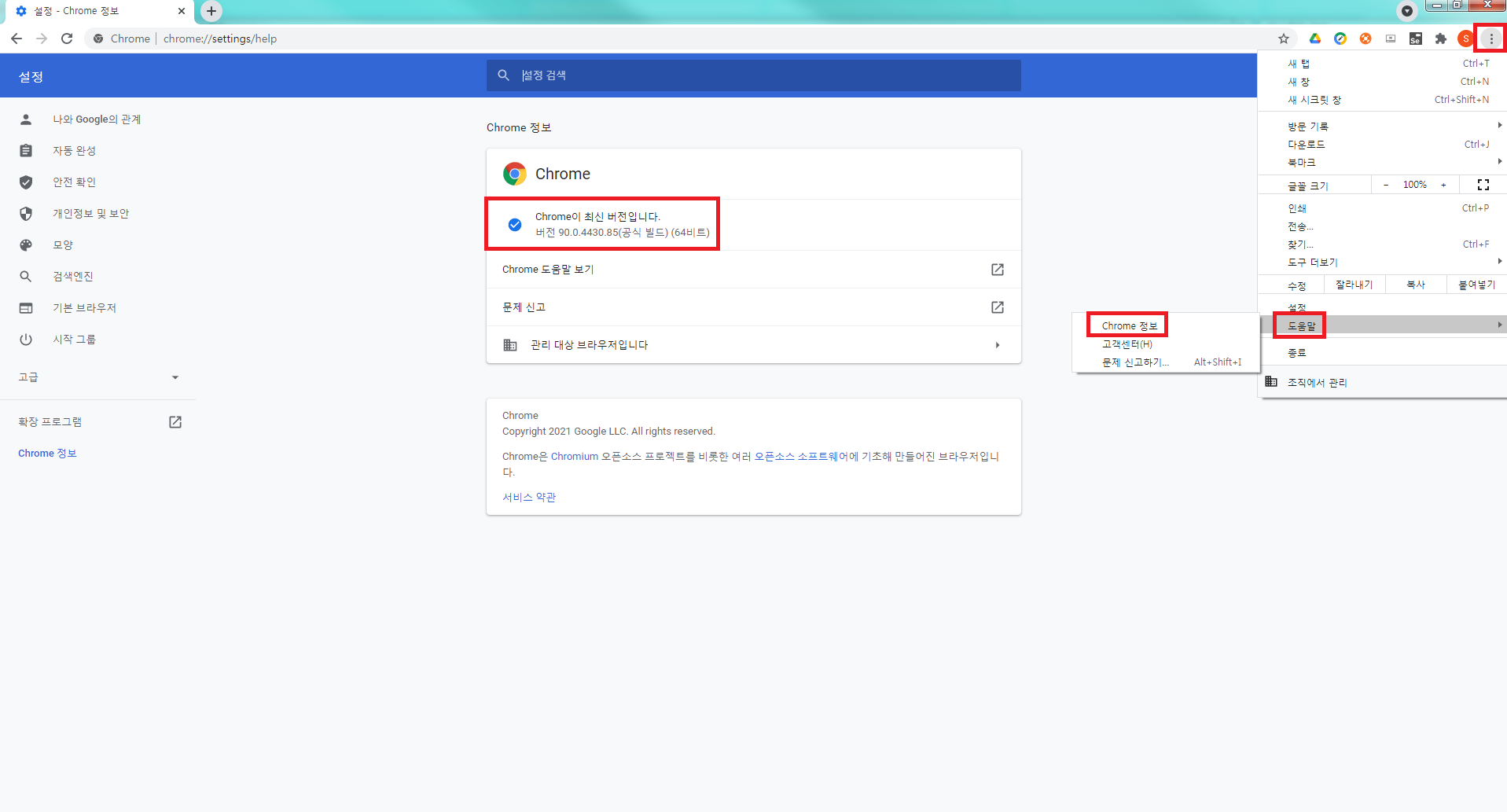 메뉴에서 도움말 - Chrome 정보에 들어갑니다