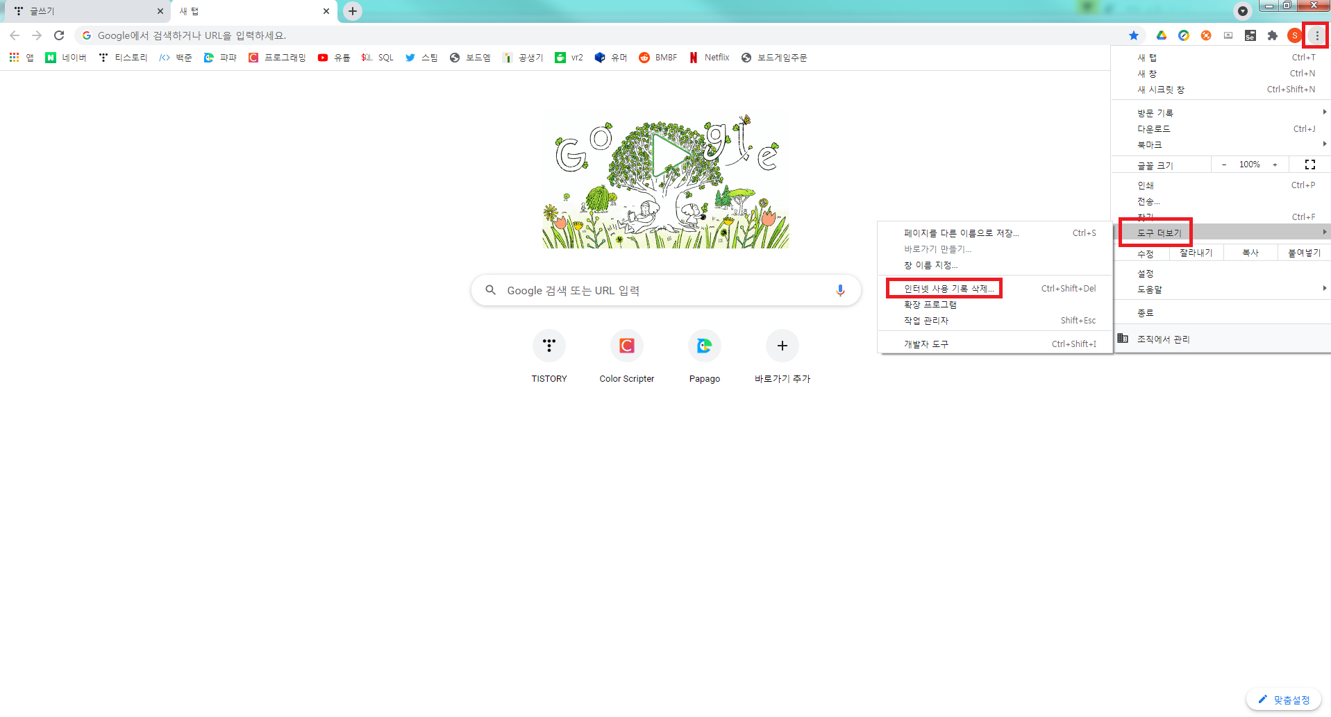 메뉴가 나타나면 도구 더 보기 - 인터넷 사용 기록 삭제에 들어가서 삭제합니다
