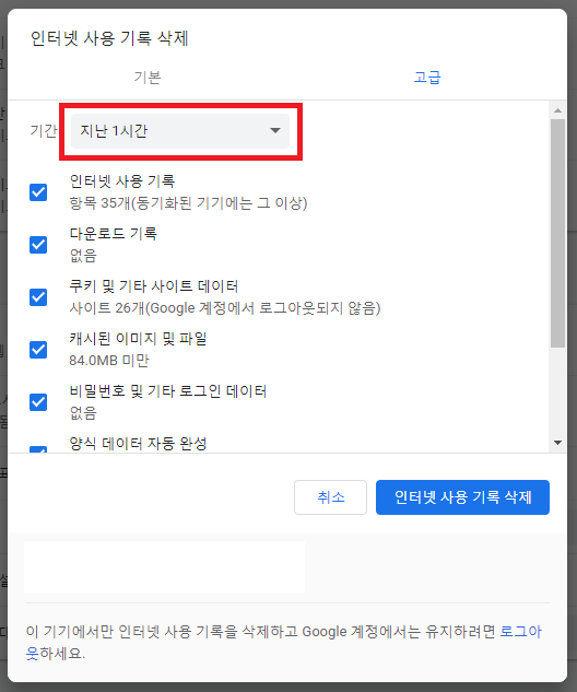 이 지난 1시간을 변경해야 전체 인터넷 사용 기록이 삭제가 됩니다