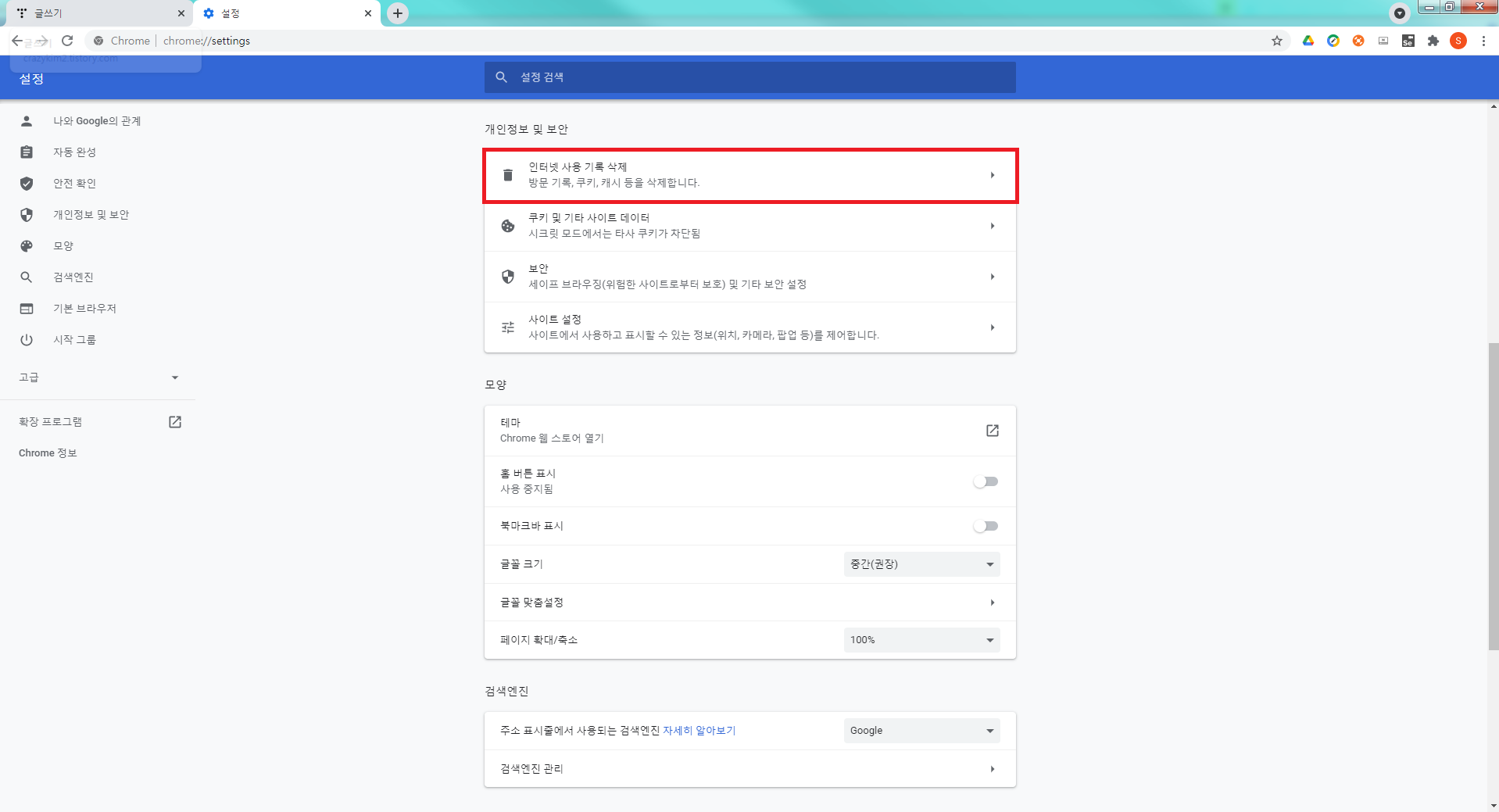 이어서 개인정보 및 보안탭의 인터넷 사용 기록 삭제에 들어가서 사용기록을 삭제할 수 있습니다