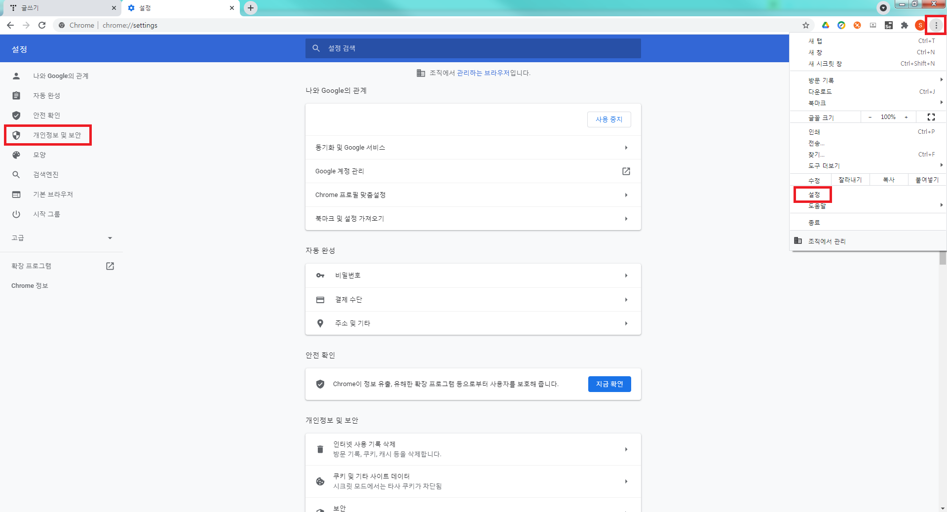 설정으로 들어가서 왼쪽 탭의 개인정보 및 보안으로 들어갑니다
