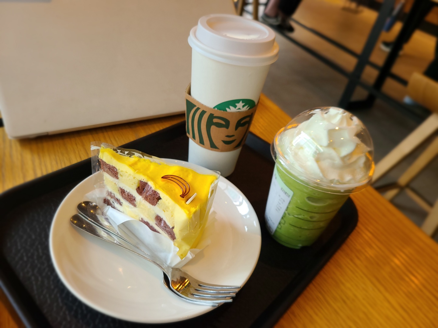 카라멜 마끼야또와 바나나 케이크를 먹었습니다 헿