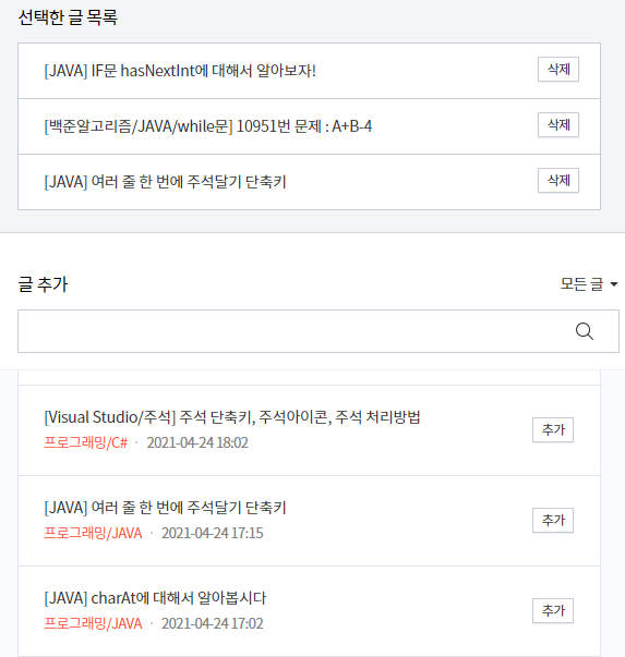 글 선택 : 글 선택을 하는 경우 내가 직접 메인화면 목록에 보여줄 글을 선택할 수 있습니다