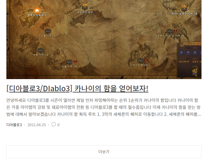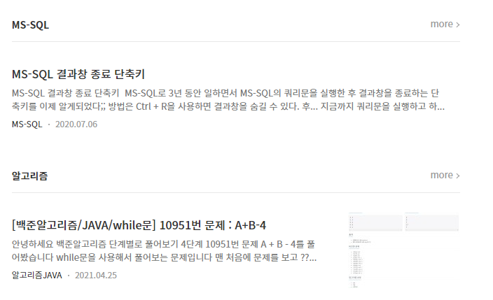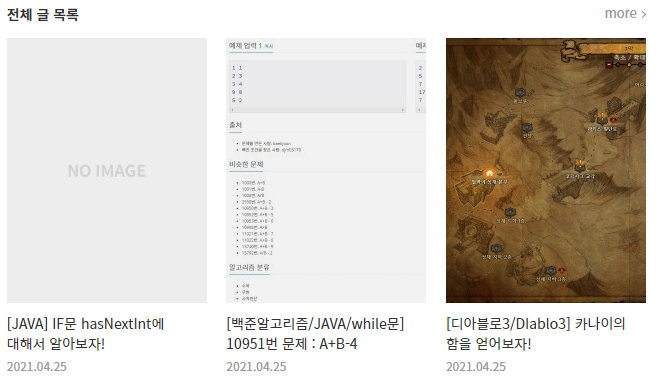 적용을 하면 아래의 화면처럼 이미지가 크기 보이고 마지막 하단에 "더보기"로 다음 글을 계속해서 확인할 수 있습니다