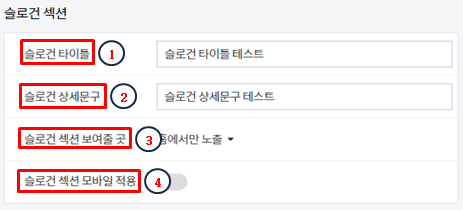 3. 슬로건 섹션 보여줄 곳 : "홈에서만 노출", "홈과 목록에서 함께 노출" 두 가지가 있습니다