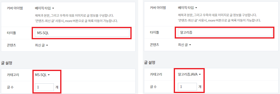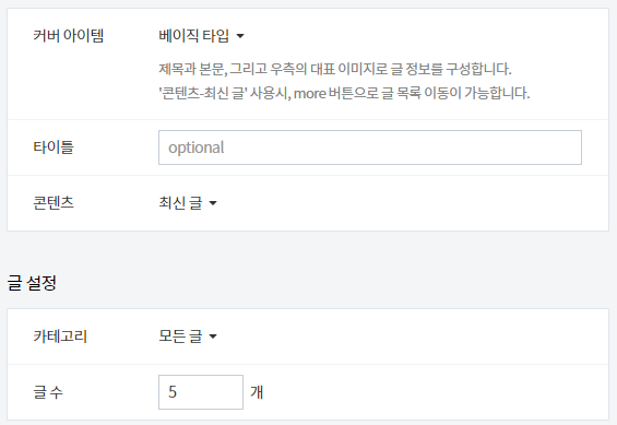 최신 글을 보여줄 카테고리와 카테고리 중에서 몇 개를 보여줄지 선택합니다