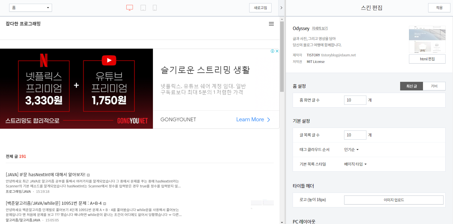 이러저리 방법을 찾다 이번에 제 블로그를 Odyssey로 스킨을 변경하면서 글 본문도 제가 글쓴대로 깔끔하게 변하고 블로그도 새로워진 느낌이 됐습니다