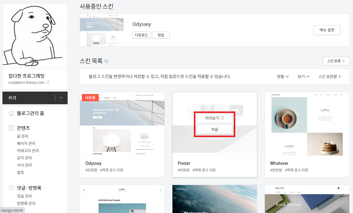 "적용"을 선택하면 내 블로그가 선택한 스킨으로 변경이 됩니다