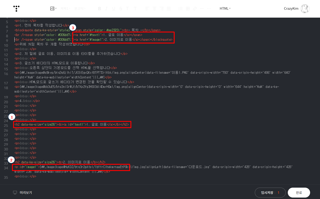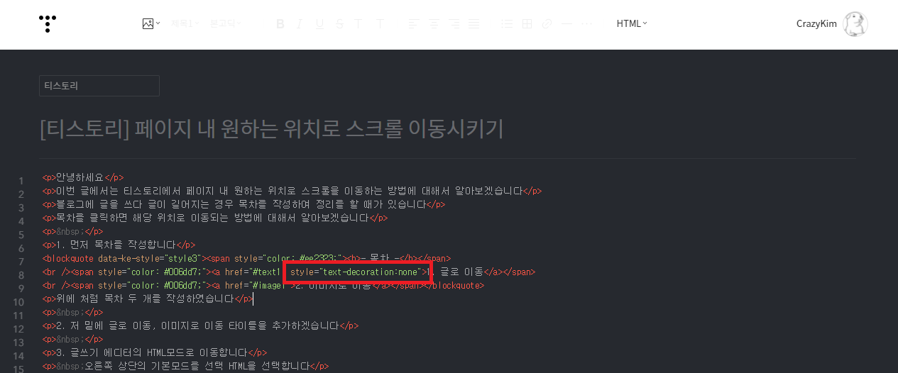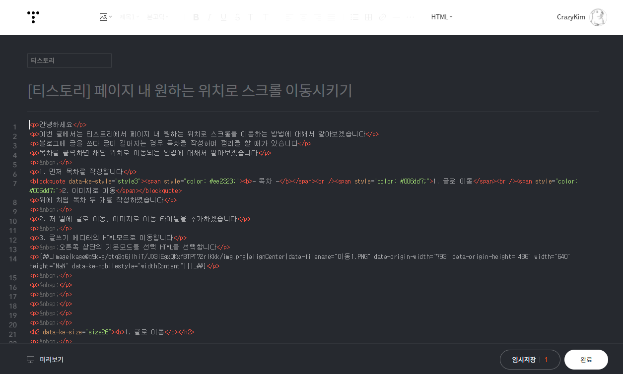 HTML모드로 글쓰기 에디터가 변경된 것을 확인할 수 있습니다