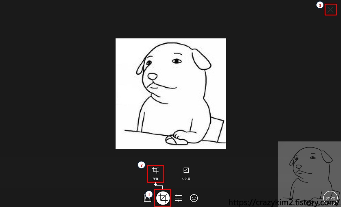 3. 이미지편집을 종료하고 싶은 경우 오른쪽 상단의 "X"버튼을 클릭합니다