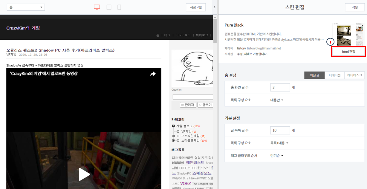 왼쪽 메뉴의 "꾸미기"탭의 "스킨 편집"메뉴로 들어갑니다