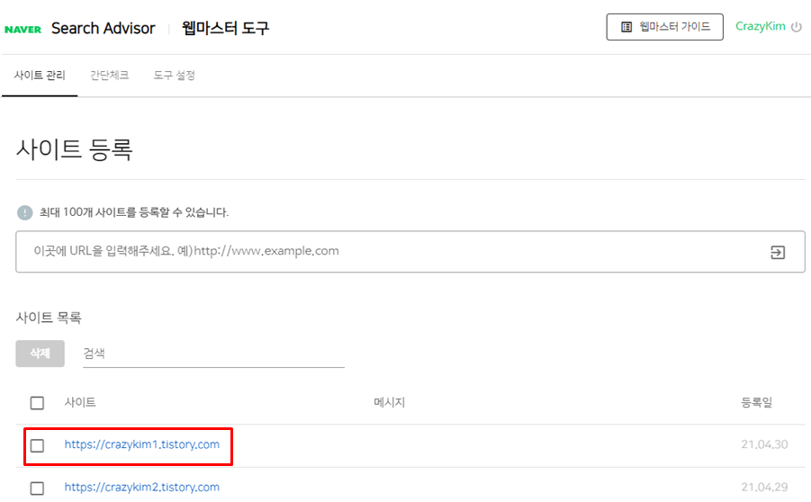 정상적으로 등록이 되면 사이트 목록에 내 블로그가 추가된 것을 확인할 수 있습니다