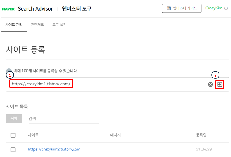 1. 사이트 등록에 웹 마스터 도구에 등록할 내 블로그의 주소를 입력합니다