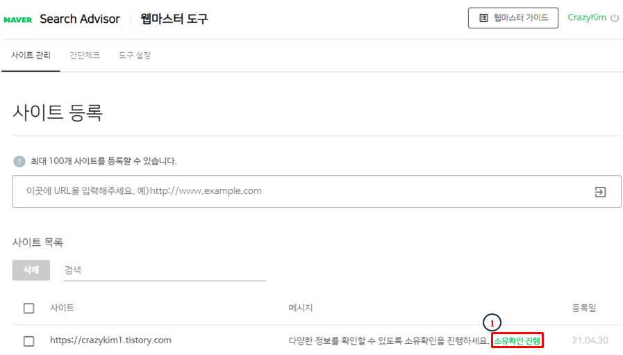 2. "확인"버튼을 눌러서 사이트 소유 확인을 완료합니다
