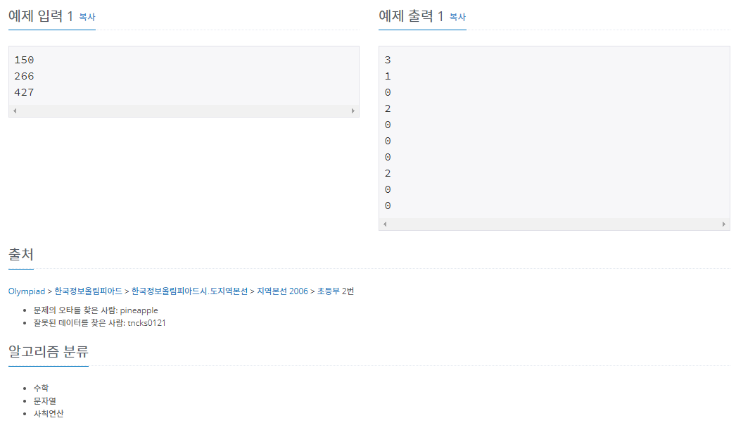 예를 들어 A = 150, B = 266, C = 427 이라면 A × B × C = 150 × 266 × 427 = 17037300 이 되고, 계산한 결과 17037300 에는 0이 3번, 1이 1번, 3이 2번, 7이 2번 쓰였다.
