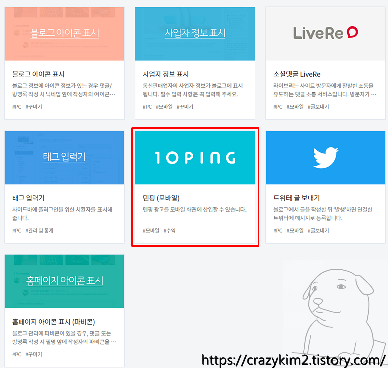 그 외에 티스토리 플러그인 중 텐핑(10ping)이란 마케팅 플랫폼을 사용하여 수익을 낼 수도 있습니다