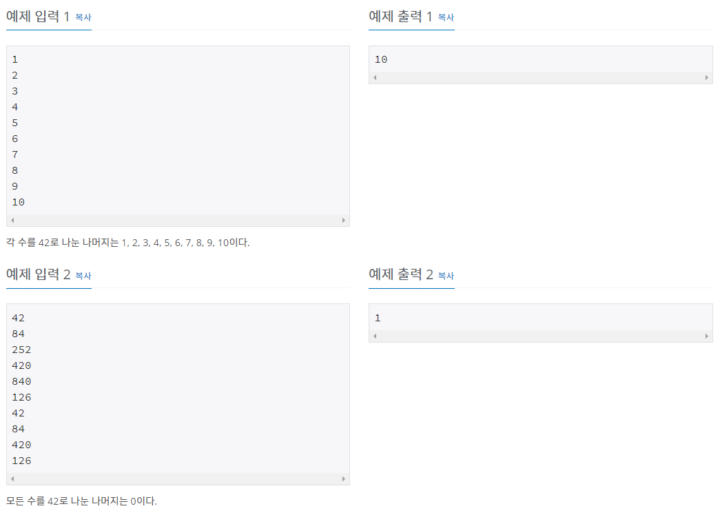 // 1. 반복문을 사용 42로 나눈 나머지 값을 HashSet에 추가