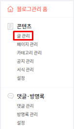 오른쪽 메뉴에서 "콘텐츠"탭의 "글 관리"메뉴로 이동합니다