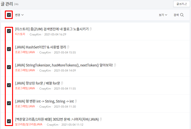 글 관리 아래의 체크박스를 선택하면 모든 글 목록이 선택됩니다