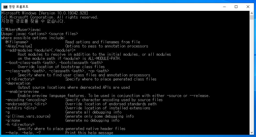 명령 프롬프트에 접속하여 javac를 입력해줍시다