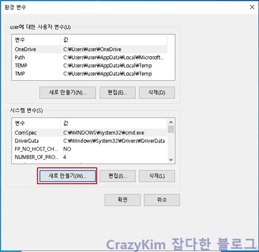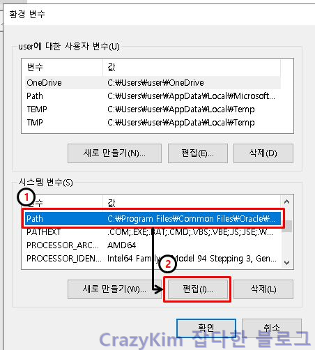 위의 방법을 참고하여 환경변수 설정 창에 들어갑니다