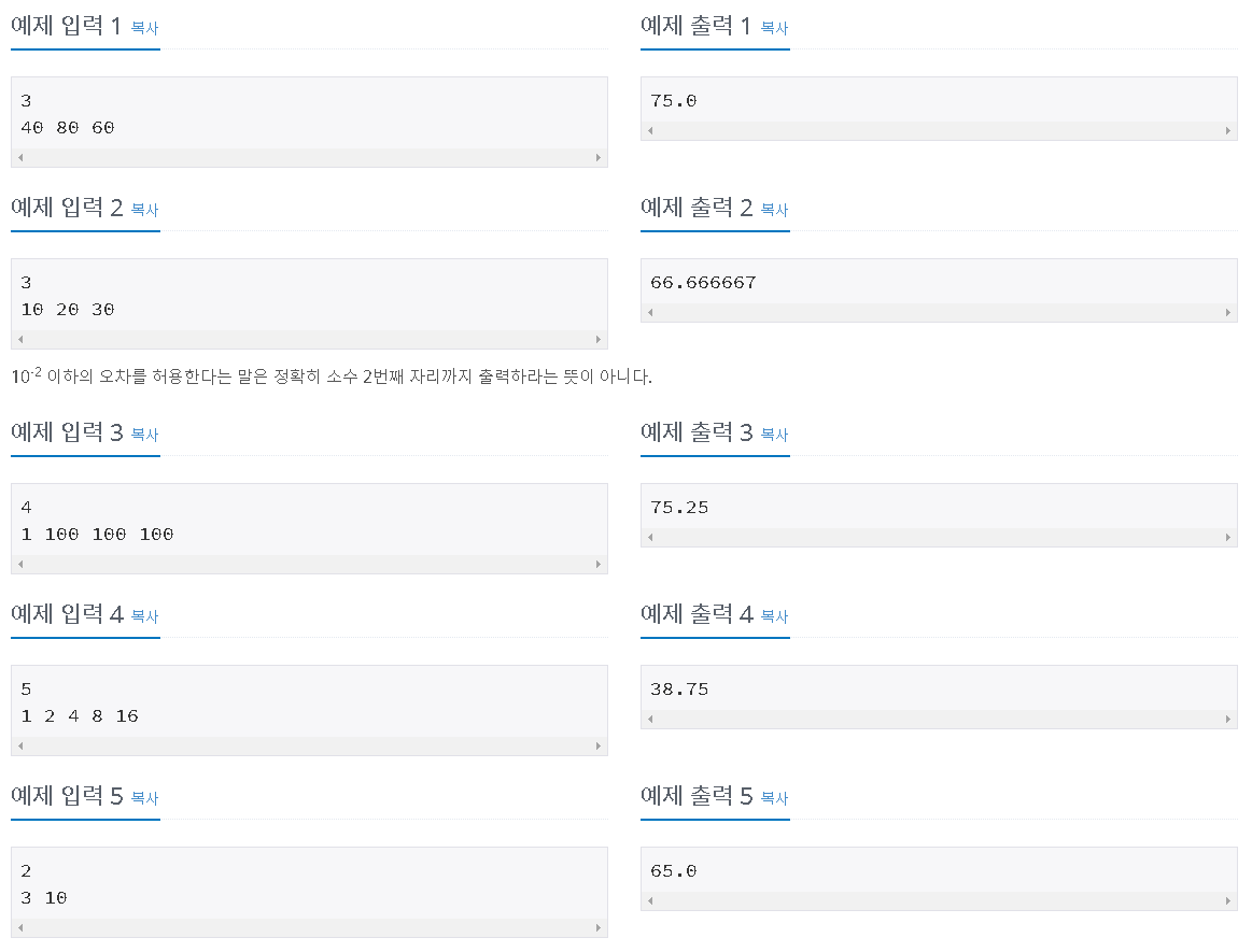 첫째 줄에 새로운 평균을 출력한다. 실제 정답과 출력값의 절대오차 또는 상대오차가 10-2 이하이면 정답이다.