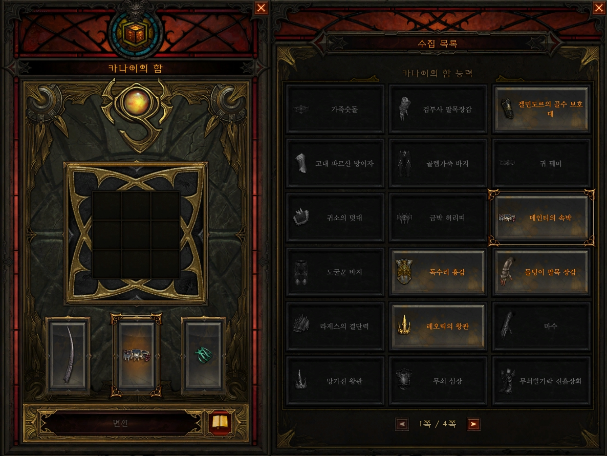 디아블로3에서는 착용하는 아이템 이외에도 카나이에 전설 능력을 추출하여 아이템의 효과를 캐릭터가 받을 수 있습니다