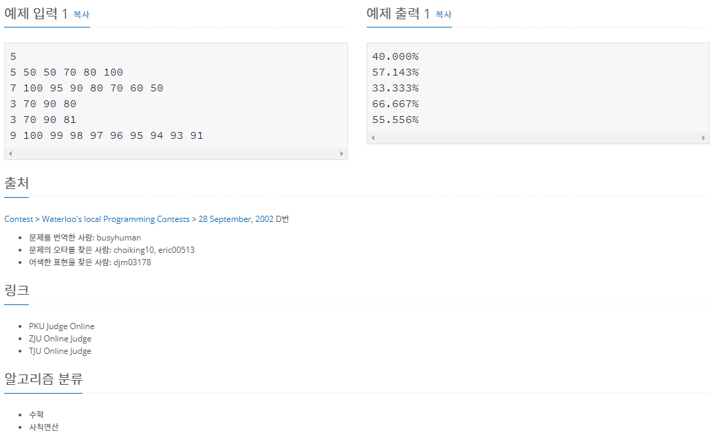 둘째 줄부터 각 테스트 케이스마다 학생의 수 N(1 ≤ N ≤ 1000, N은 정수)이 첫 수로 주어지고, 이어서 N명의 점수가 주어진다. 점수는 0보다 크거나 같고, 100보다 작거나 같은 정수이다.