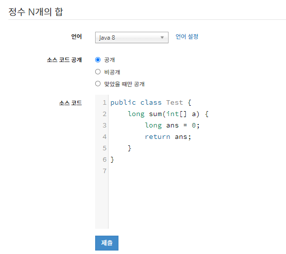 - Java: long sum(int[] a); (클래스 이름: Test)