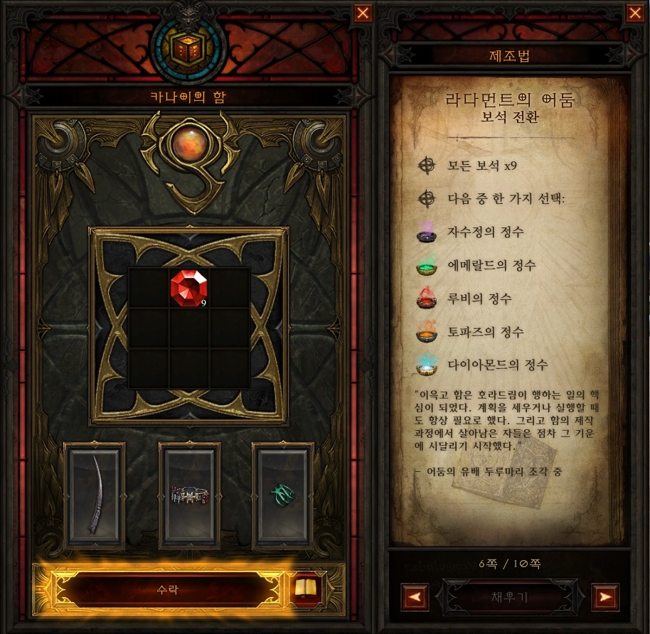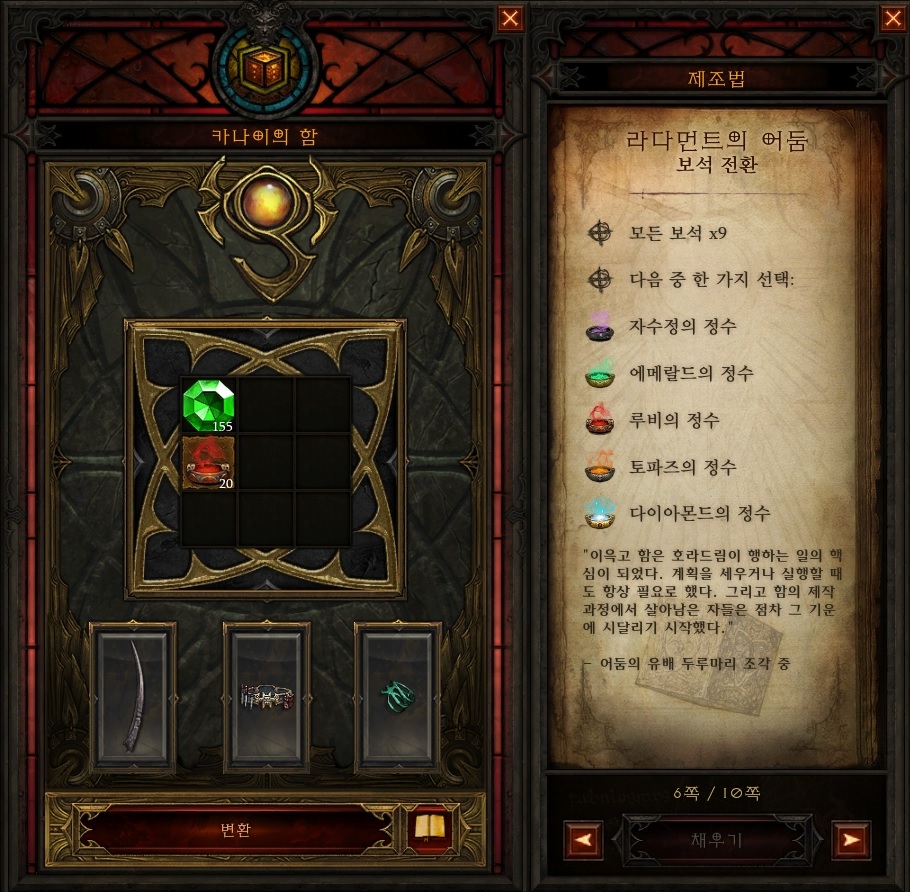 "변환"버튼을 누르면 에메랄드 보석을 루비의 정수로 통해서 루비 보석으로 변환이 됩니다