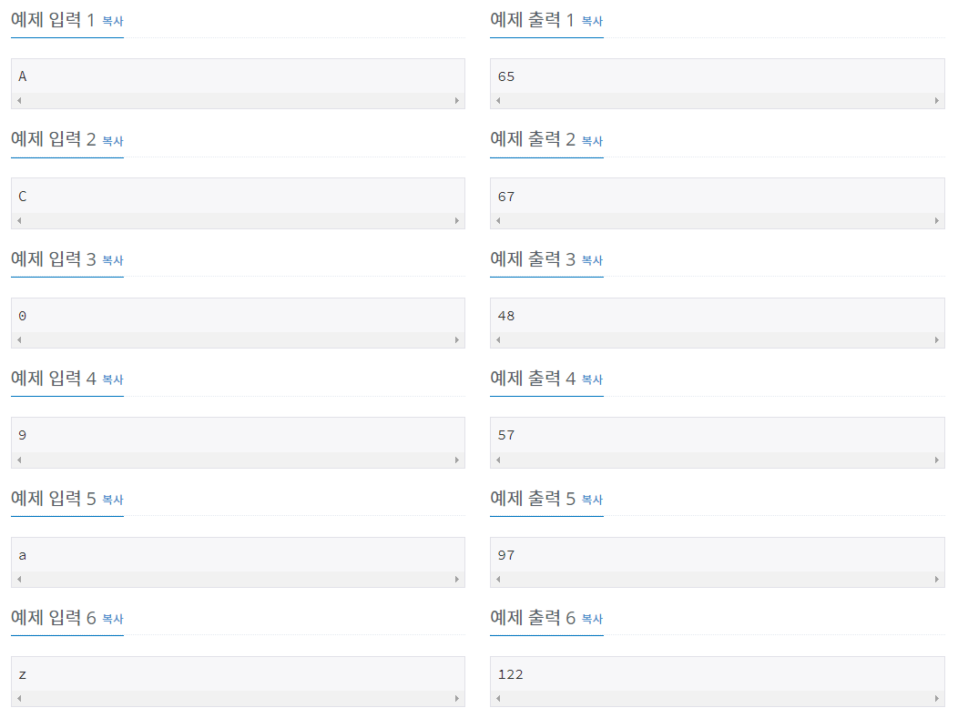 입력으로 주어진 글자의 아스키 코드 값을 출력한다.