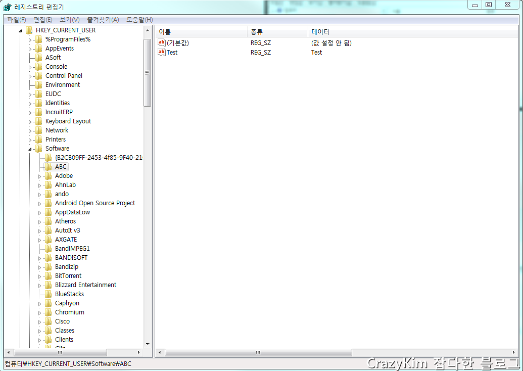 아래와 같이 쓰면 HKEY_CURRENT_USER\Software\ABC\Test 레지스트리가 생성된 것을 확인할 수 있습니다