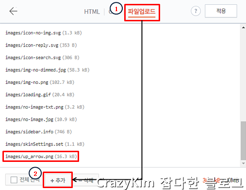 2. 아래의 "추가"버튼을 선택하여 위로 가기 버튼 이미지를 블로그에 추가해줍시다